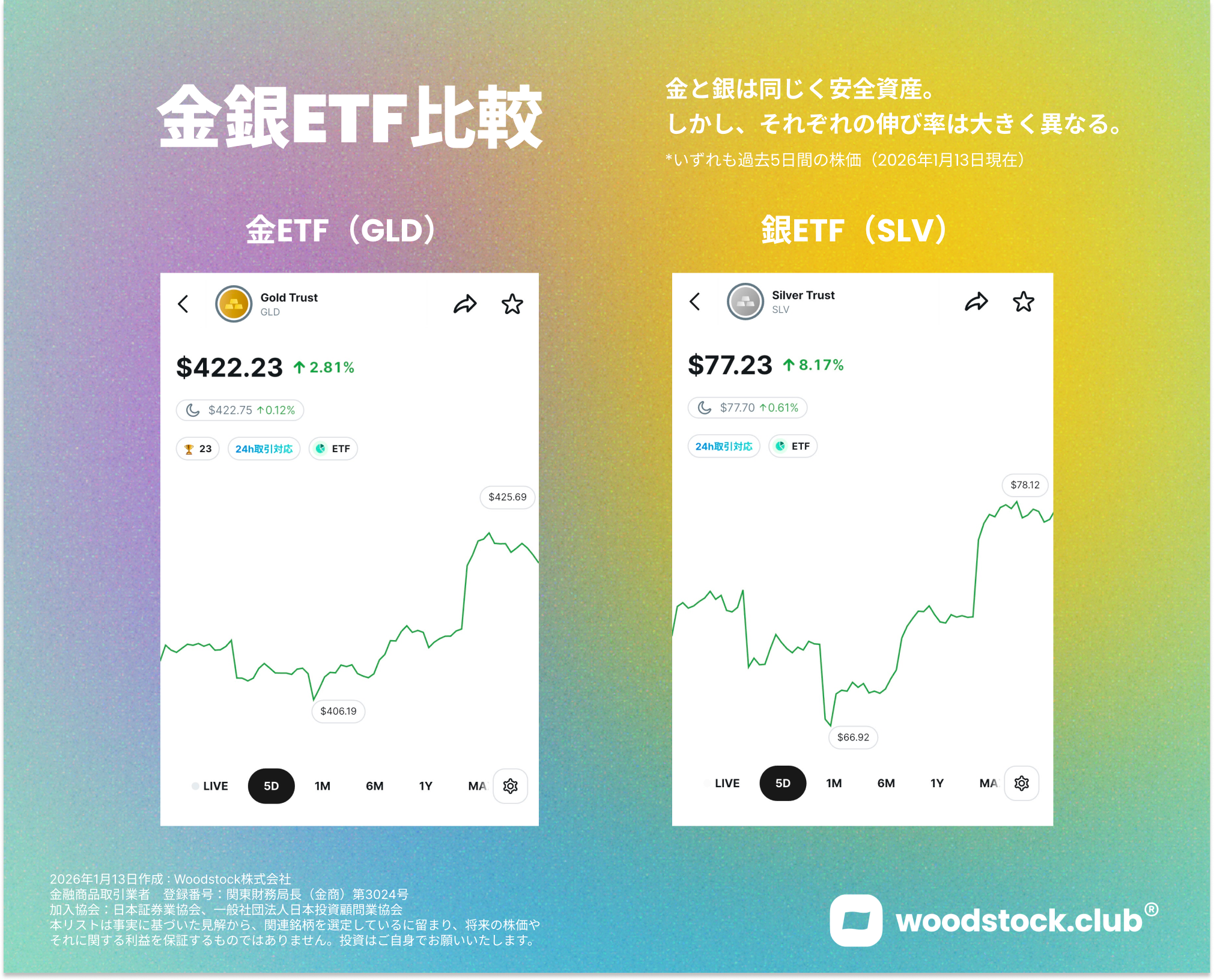 金ETF ($GLD)とSLV($SLV)の過去5日の株価(2026年1月13日現在)/ woodstock.club