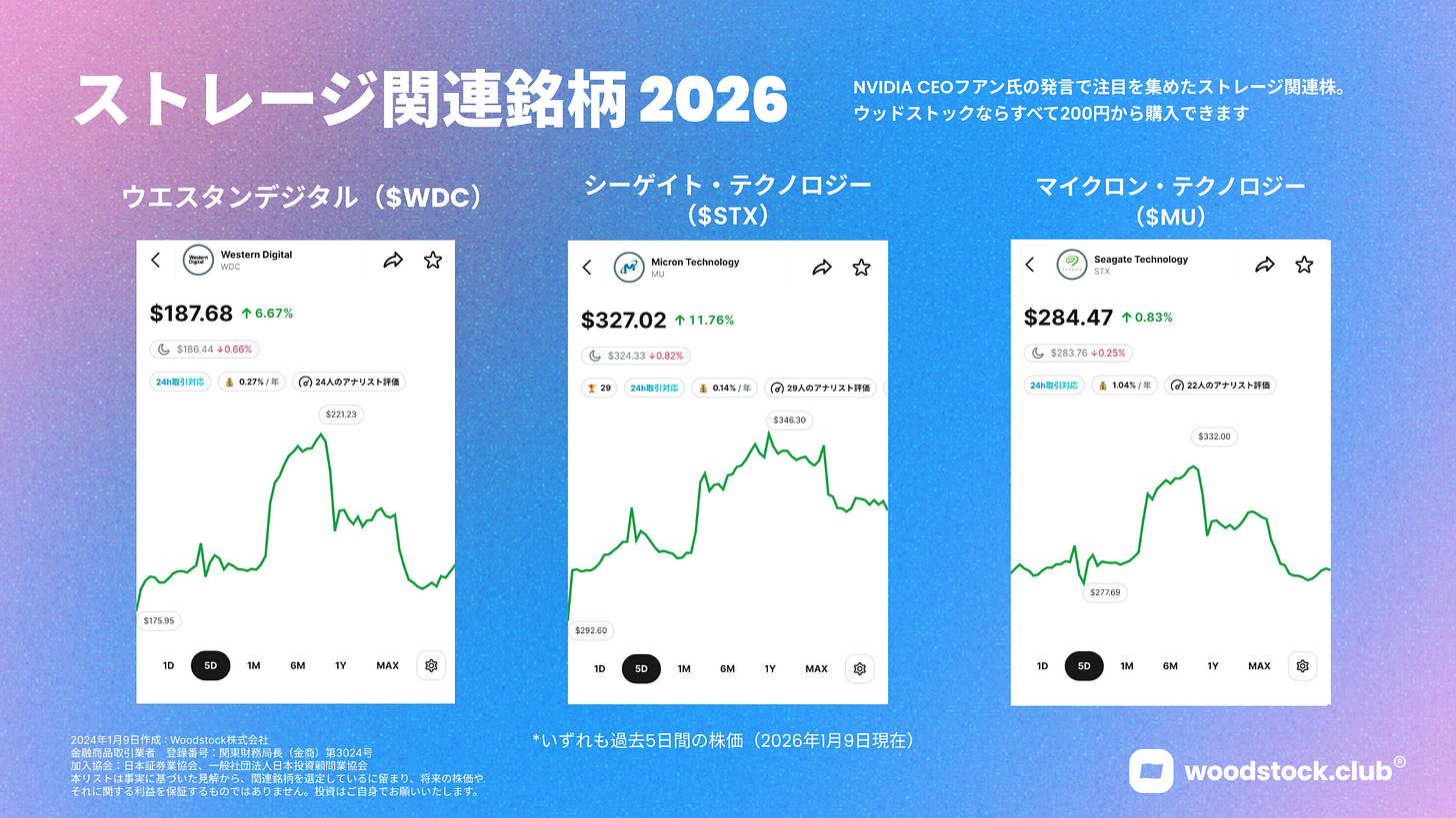 NVIDIA CEO ジェンスン・フアンがCES 2026での発言をきっかけに、ストレージ関連株が軒並み急騰しました。なぜストレージ関連株が伸びたのか、その背景を解説します。