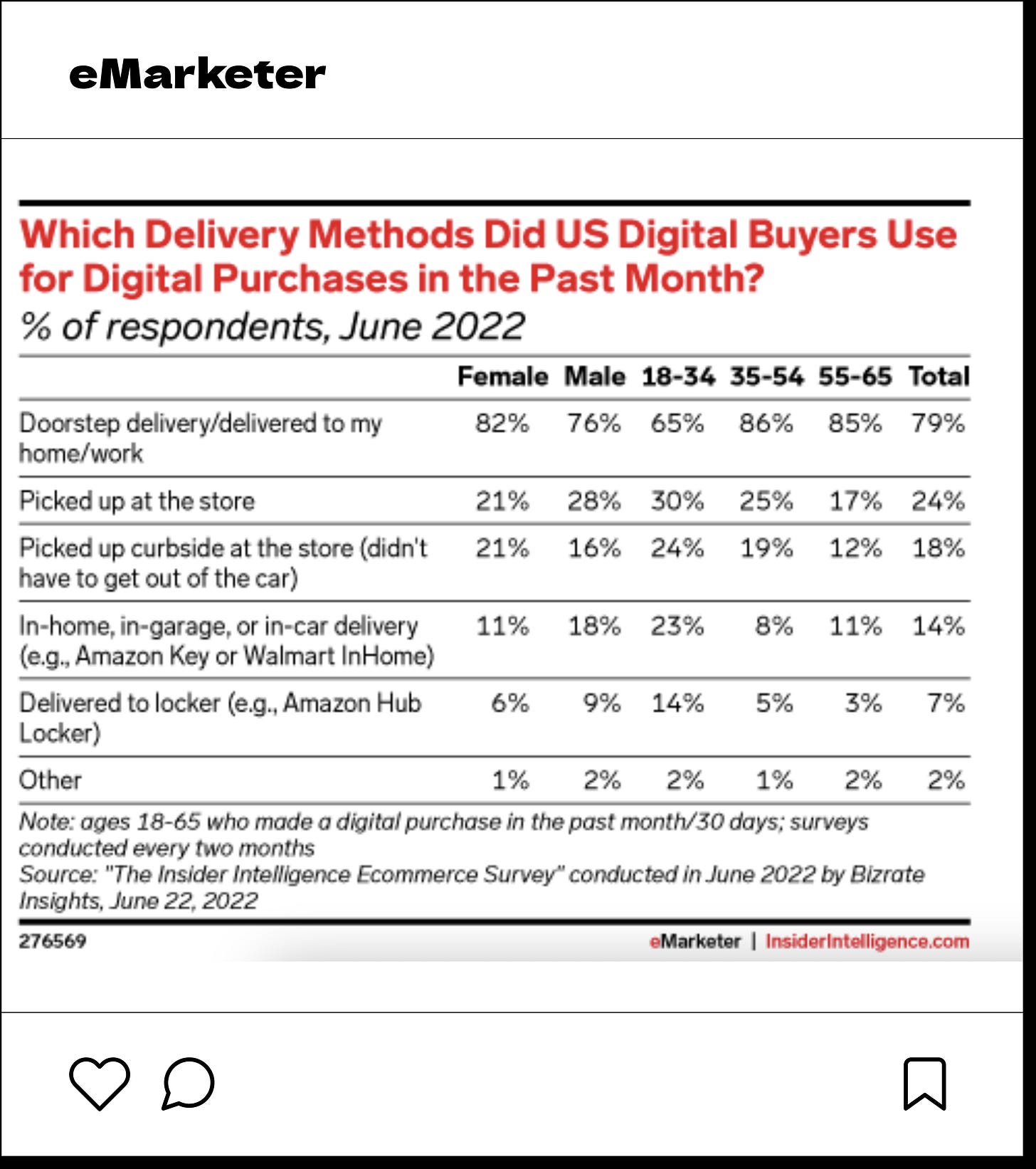 実店舗を持つもう一つの大きな理由は、顧客の指定する配送方法と関係があります。アメリカでは、配達後に荷物を盗まれることがよくあるそうです。(日本ではあんまり考えられないかもしれませんが。)2020年のパンデミックでは、アメリカでの荷物の盗難が過去最高となり、毎日170万個の荷物が盗まれ、アマゾンにとって大きな悩みの種となりました。この表を見てみると、いつ届くかわからない状態で家で待つよりも、店舗やロッカーのような安全な場所で商品を受け取りたい人と考える人が多いことがうかがえるます。つまり店舗を持ってれば、それはオンラインショピングでの受け取り先としても効果を発揮するのです。