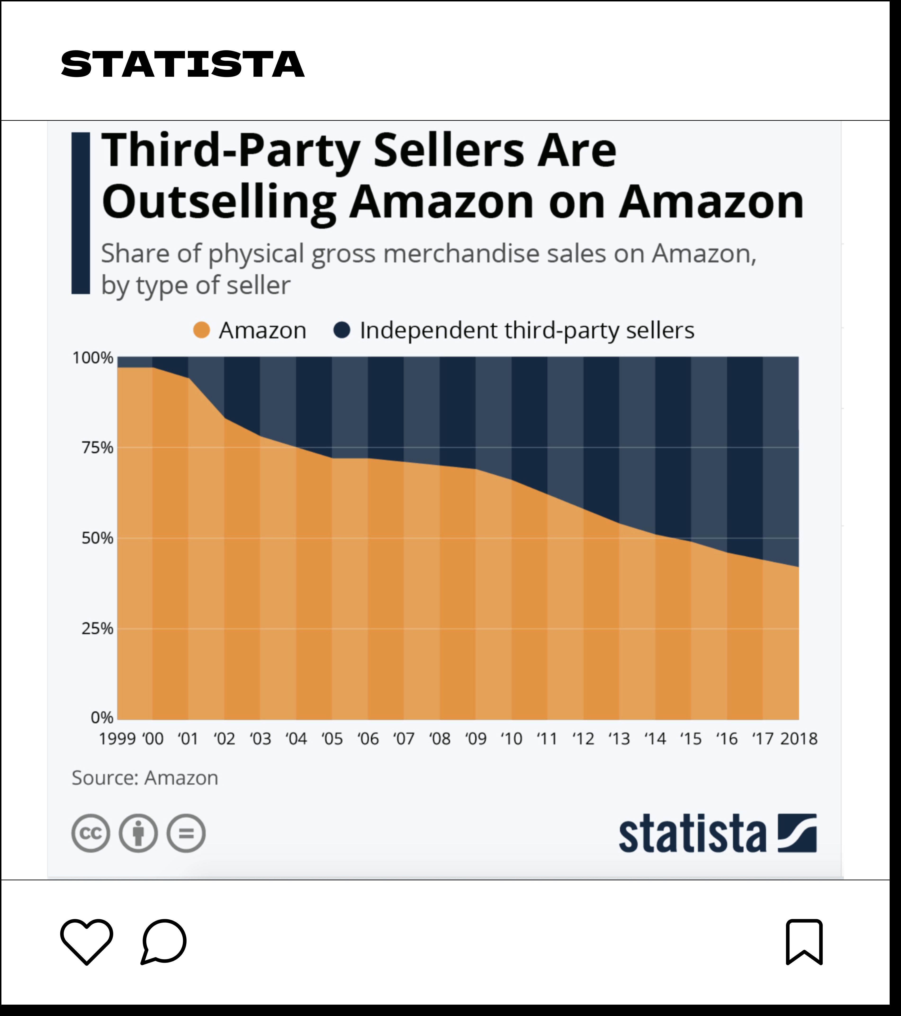その理由はというと、アマゾンのeコマースプラットフォームのビジネスとしては、アマゾン自身がファーストパーティーの卸売り業者として、在庫を仕入れてそこに利益を乗せて売るか、アマゾンのサードパーティーである業者を通じてエンドユーザーに直接商品を販売してもらい、彼らから販売ごとにいくらかの手数料を受け取るかのいずれかです。アマゾンは規模を拡大していくためには、より多くのサードパーティセラー(委託業者)が必要であることを認識しています。実際、2018年以降は、サードパーティセラー(委託業者)の売上がアマゾン自身での販売を上回っているのです。このグラフをご覧ください。