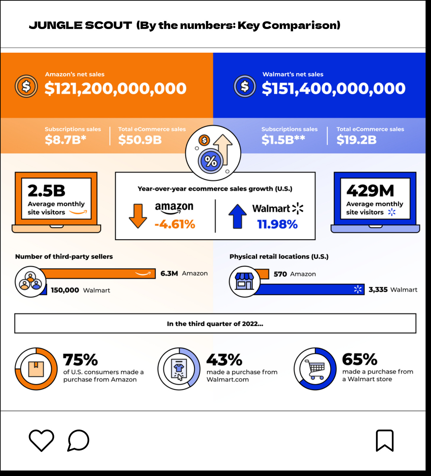 アマゾンとウォルマートの数字を、横並びの比較をしたのがこちらのグラフです。データは昨年第3四半期以降のものです。アマゾンのeコマース総売上は510億ドル、一方ウォルマートのeコマースは190億ドルです。ウォルマートの総売上高のうちeコマースは約13%を占め、そのeコマース売上は12%成長していますが、同じ期間でアマゾンの売上は-4.6%の減少となっています。月間サイト訪問者数は、アマゾンが25億人であるのに対し、Walmartは4億2900万人なので、およそ5倍以上の人がアマゾンでオンラインショッピングを利用しているという状況です。