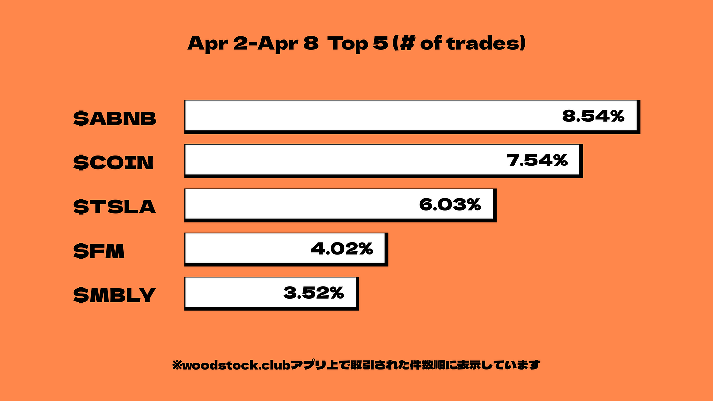 Woodstock.clubアプリ上で、先週(4/2-4/8)売買された銘柄ランキングはこれだ!