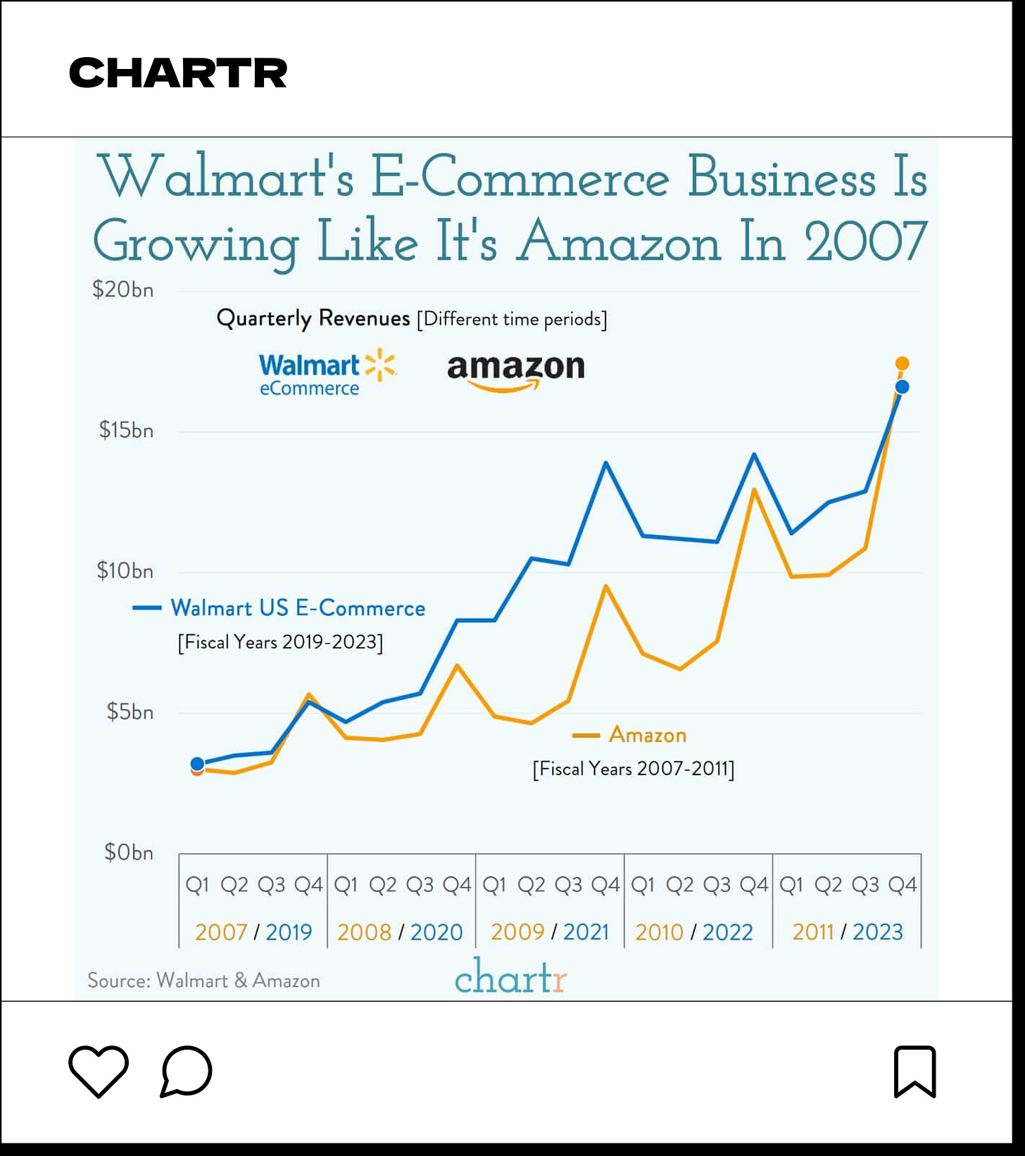 さて、ではウォルマートの何が一体そんなに興味深いのか。次のチャートを見てください。このグラフは、2019年から2023年までのウォルマートのeコマースでの収益と、2007年から2011年までのアマゾンの収益を比較しています。このグラフで興味深いのは、eコマースにおいては、アマゾンに遅れること12年のウォルマートが、アマゾンがeコマースで急成長していた頃と比較して、非常に似た成長率を叩き出していることです。