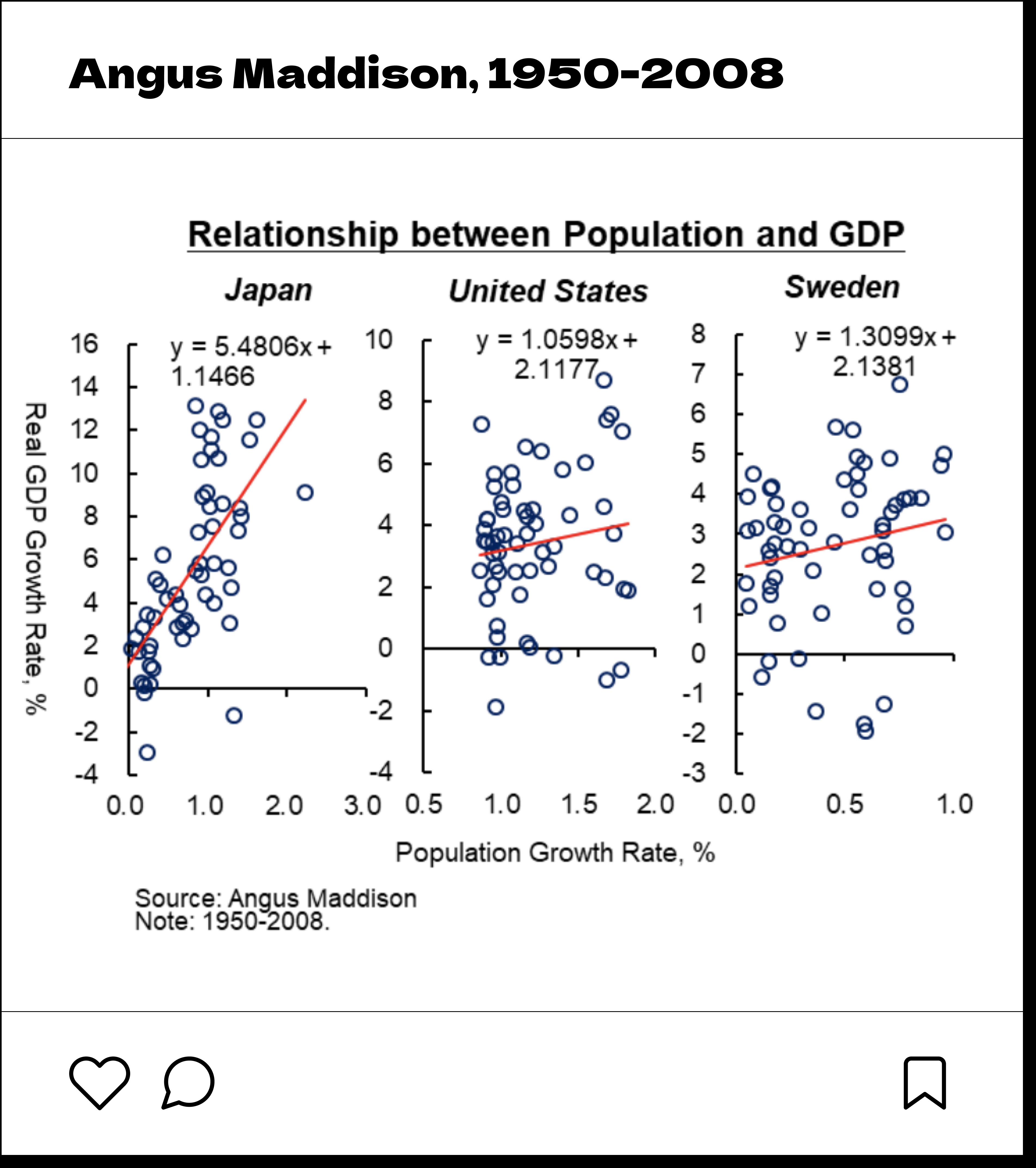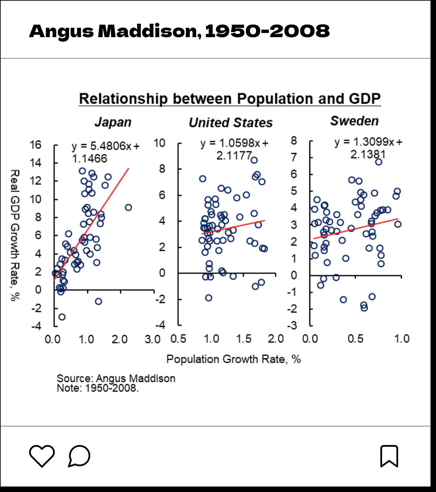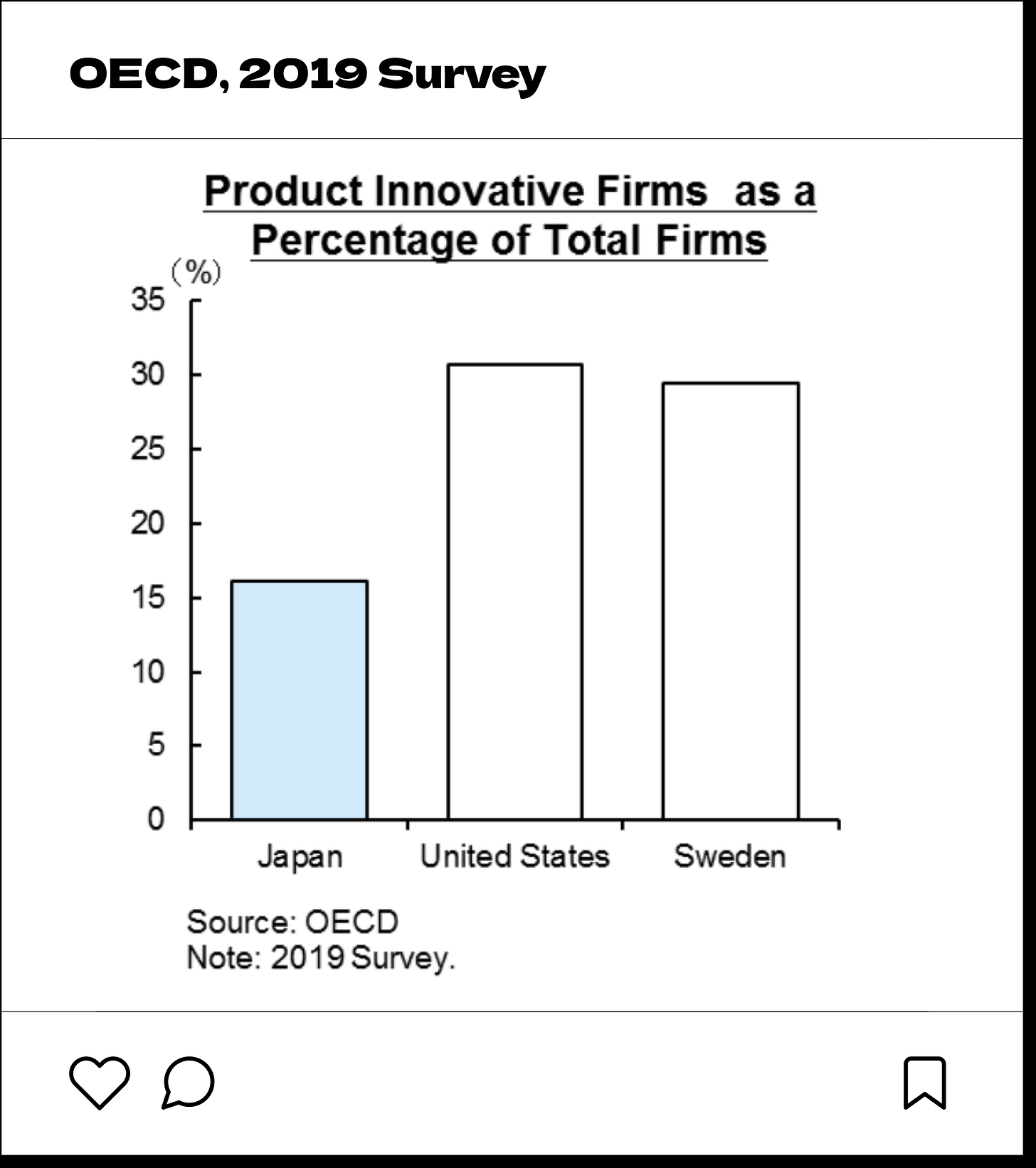 米国やスウェーデンと比較して見ても、日本のGDPは人口と密接に関係してきました。しかしながら全体に占める、イノベーション企業は両国と比較して明らかに少ない状況です。日本のGDPが人口起因の理由以外での成長がまだできるとしたら、多くの製品においてイノベーションをもっと生み出す必要があるということはもはや明白です。