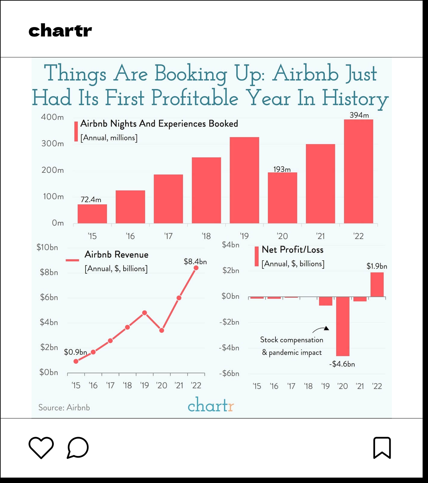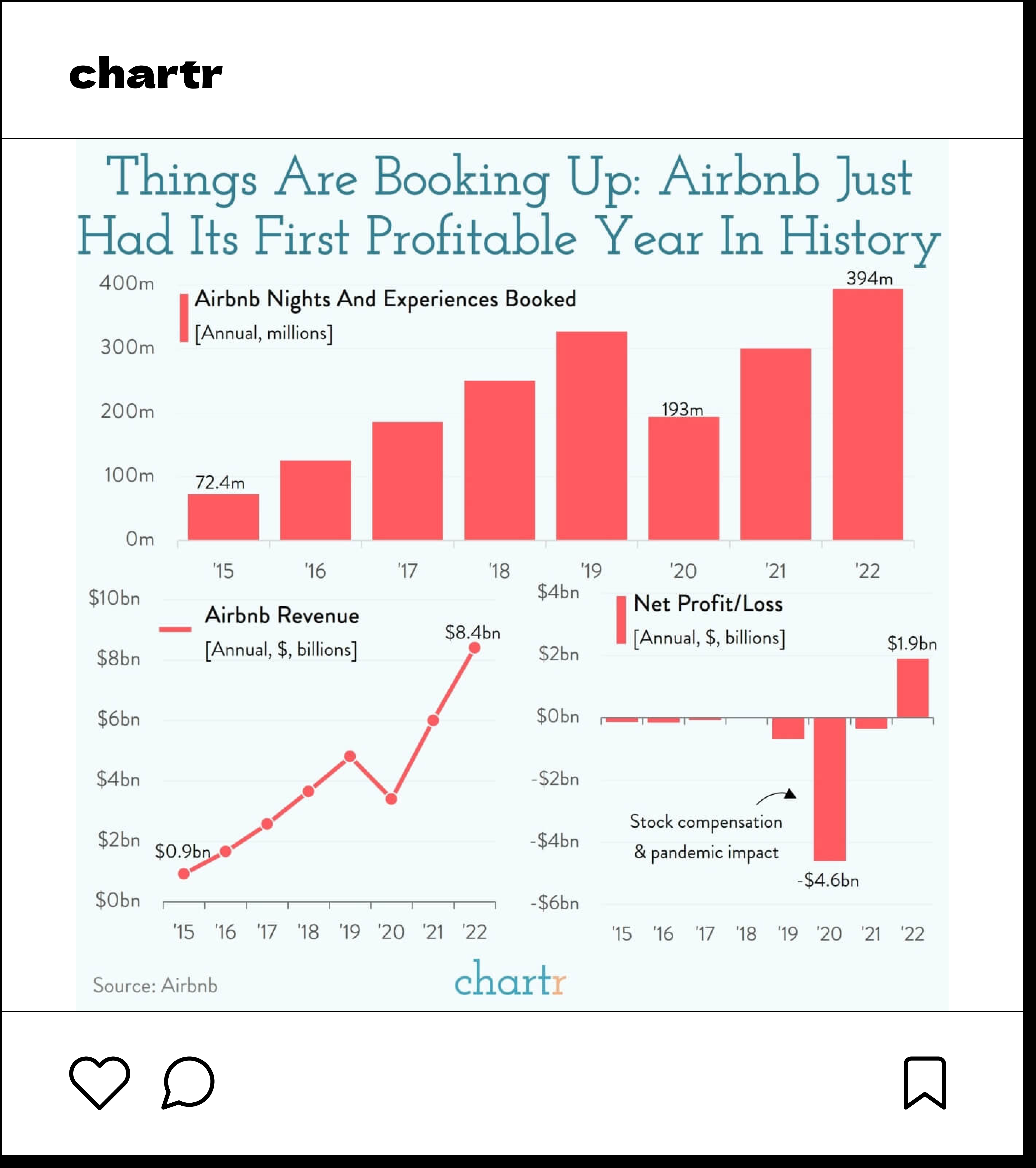 Airbnbの過去数年間の純利益の推移をみてみてください。同社はパンデミックの際、同社は明らかに大きな打撃を受け、Brian Chesky CEOは2020年5月人員削減という厳しい決断を下さなければなリませんでした。しかし、彼のリーダーシップはパンデミック時においても目を見張るものがあり、ロックダウン中にすぐに「オンライン体験プログラム」を提供するイノベーションに真っ先に取り組みました。