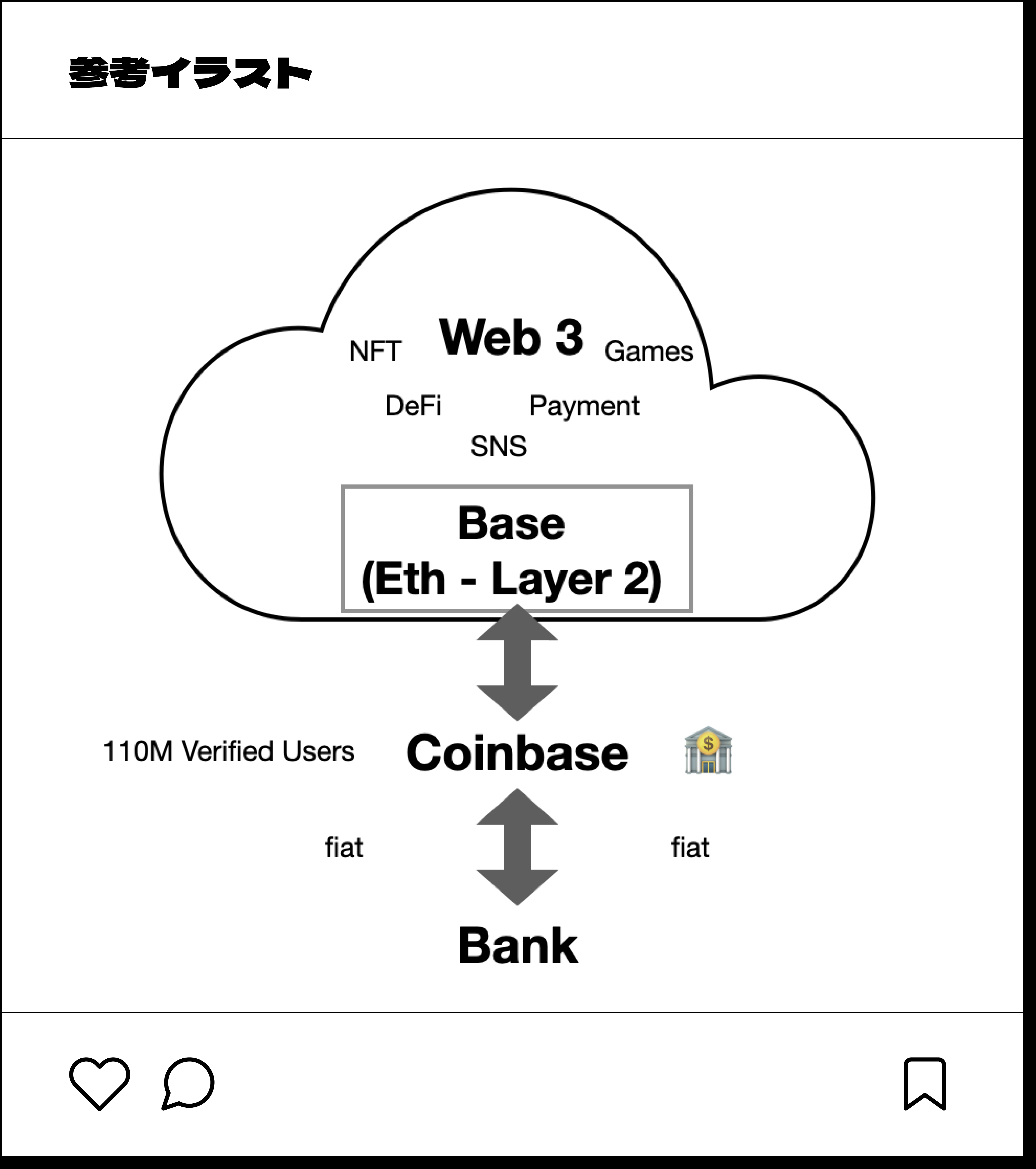 「安全性」と「低コスト」はとても大切な一方で、Optimismのチェーンをフォークすれば、誰でもこれら二つについては実現することができます。「開発者に優しい」というのは、まさにCoinbaseが独自に暗号資産のエコシステムに価値を与えられる領域なのです。なぜでしょうか?Coinbaseは、すでに1億1000万人の「認証済み」ユーザーを抱えています。彼らは決済ネットワークや取引所を通じて、これらのユーザーをそのまま誘導、つまりフィアット通貨(:円やドルなど中央銀行が発行した通貨)を暗号通貨に変換する能力を持っています。現在、これらのユーザーをWeb3アプリに接続するための橋と高速道路を建設しているのです。なぜ「開発者に優しい」のか?それは、なぜなら、Web3の開発者が「Base」で構築する限り、彼らはCoinbaseのユーザーと製品にアクセスでき、ユーザーは他のL1およびL2チェーンへのアクセスも持つことができるからです。次のイラストを見てください。