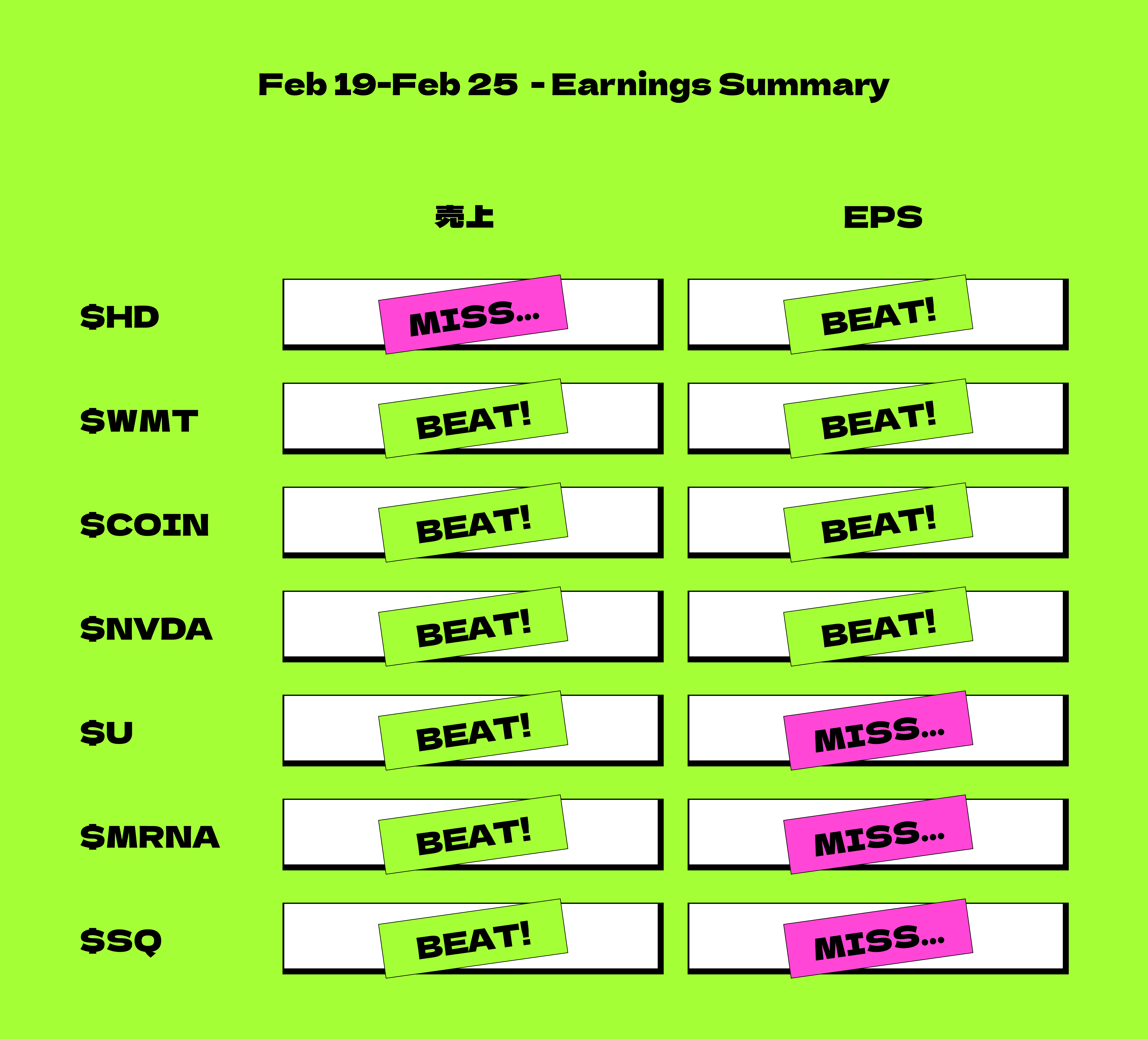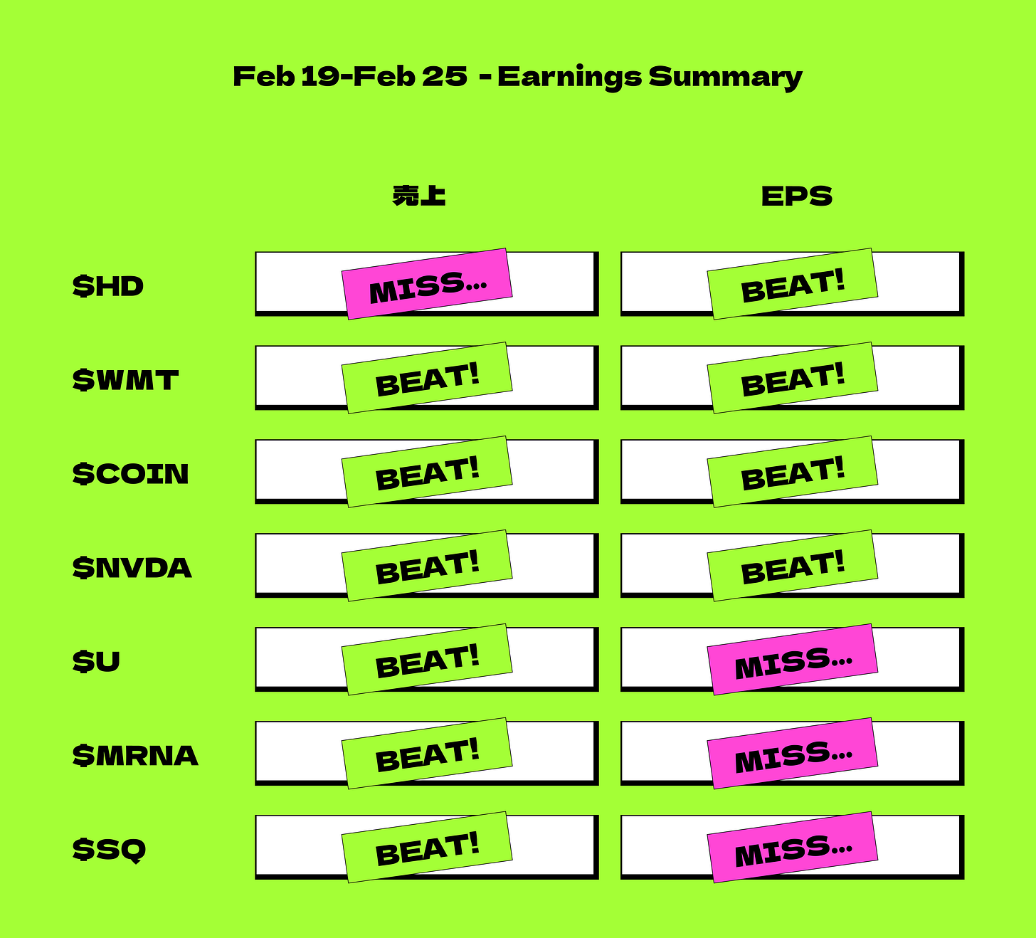 先週も多くの企業から決算発表がありました。ここではwoodstock.clubで取り上げたいくつかの決算のまとめについて改めて、ご紹介しておきます。先週は、小売、半導体、製薬などいくつか決算がありましたね。(BEAT!は、決算が予想よりもよかった時、MISS...は予想より悪かった時、INLINEは予想通りだった時をそれぞれ意味しています。)
