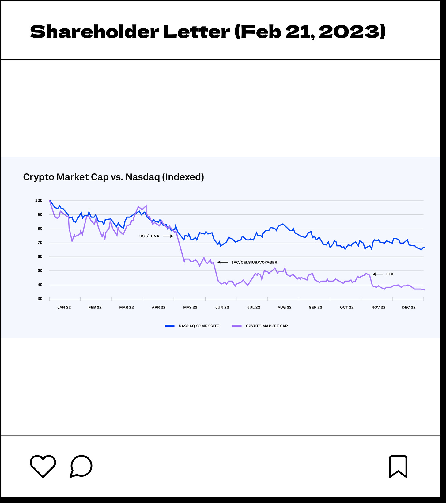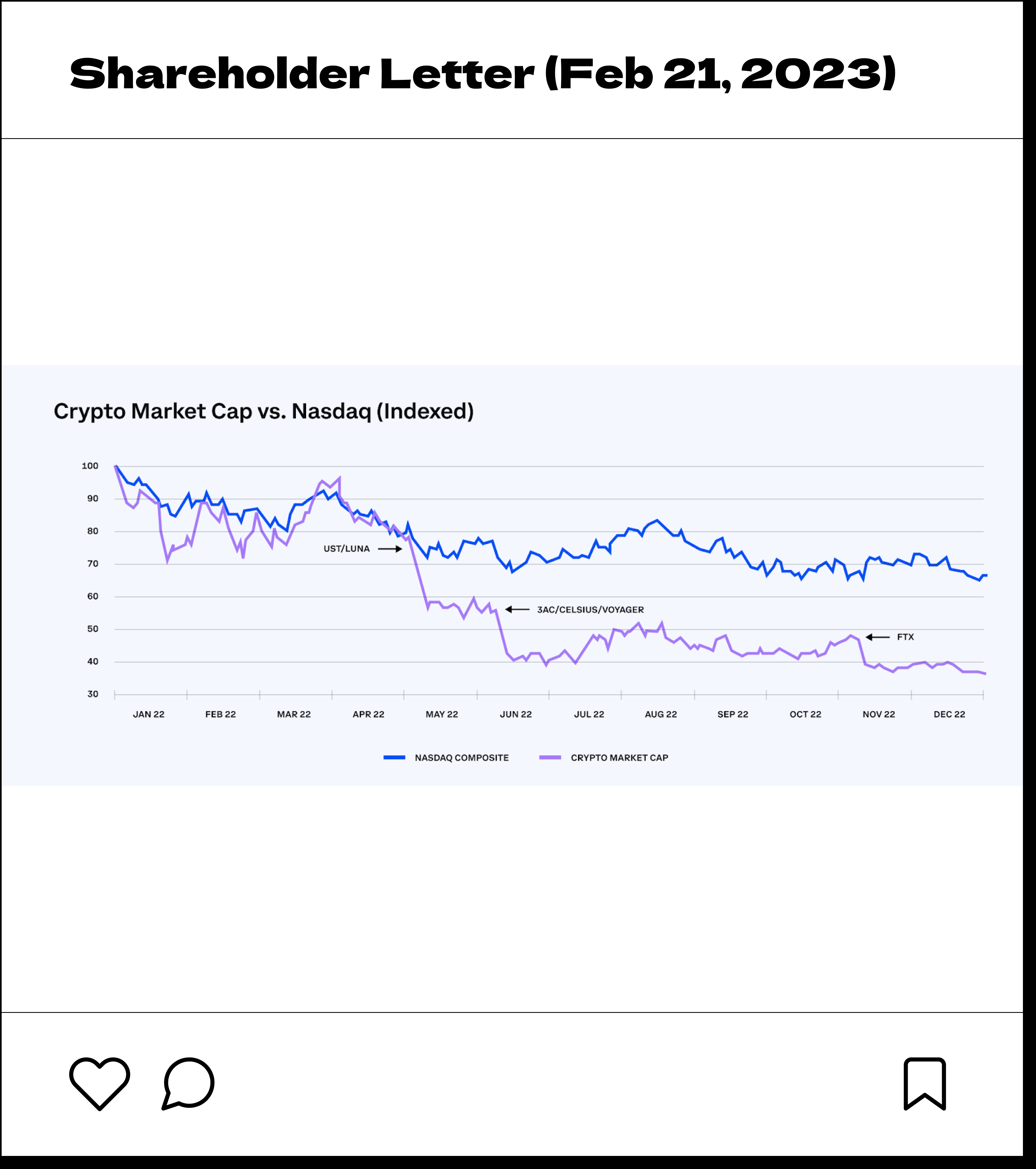 コインベースは先週、決算を発表し、売上、EPSともにアナリストの予測を上回る結果を報告しました。ご存じの通り、2022年は暗号にとっては非常に厳しい、いわゆる「暗号資産冬の時代」で、暗号資産の時価総額はナスダック指数と比較しても、より大きな下落率の1年でした。決算の中でも、昨年業界で起こったいくつかの大きなショック(UST/LUNA、3AC/Celsius/Voyager の破産とそれに続くFTXの崩壊など)について指摘しています。